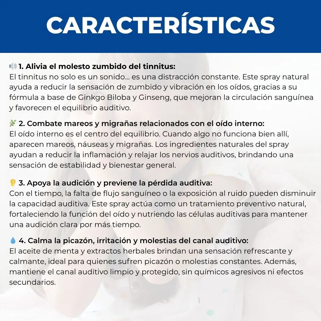 Además, su fórmula actúa no solo para tratar el tinnitus, sino también para combatir infecciones del oído, el dolor y la obstrucción de cerumen. Todo esto, sin efectos secundarios.